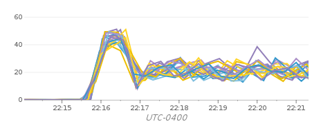 So was that the end of the load balancing issues? Not exactly. Once we had our basic gRPC-based system up and running we started running load tests against it, and noticed some interesting behaviors. Below is the per gRPC server CPU load graph over time, do you notice anything curious about it?